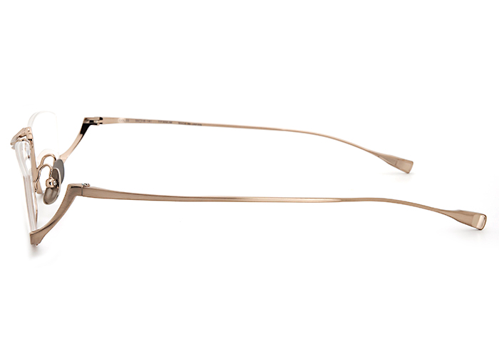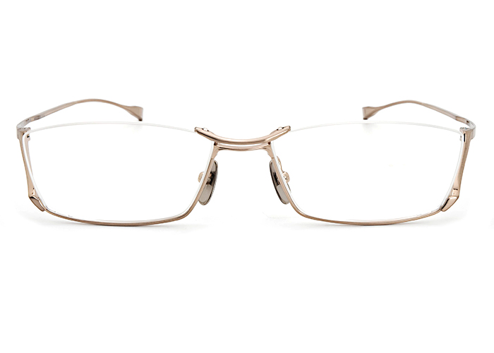 細身でありながらも存在感を放つアンダーリムは、JAPONISMの真骨頂であるシャープでありながらも力強さを放つモデル 。日本刀をモチーフにしたヨロイパーツは、研ぎ澄まされたような造形美を表現しており角度によって異なる表情を演出します。テンプルはβチタンの線材をプレス加工することでしなやかなバネ性をもたせ、自然なフィット感と長時間着用しても疲れにくい快適さを実現。さらに、テンプルエンドに適度なボリュームをもたせることで掛けた際の比重バランスとアイコンとしての形状を両立させました。カラーリングは、アンダーリムの美しいフォルムを引き出すため単色で構成。シンプルでありながらも洗練された造形美です。