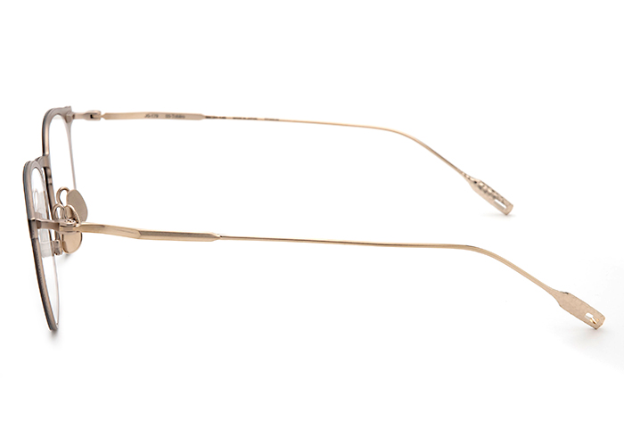 圧延したチタン板材から削り出したスッキリとしたウェリントンタイプ。フロント側面に施したコンマ数ミリの溝を境に、遊び心のあるカラーを塗り分け2mm厚のフロントに奥行き感を与えてあります。板を張り合わせたような装いが日本の重ねの美を表現しており、繊細な美しさをより一層引き立てます。伝統色を再現した落ち着きのあるカラーリングと、細部まで丁寧に仕上げられた職人の想いや温もりを随所で感じるモデルに仕上がっております。