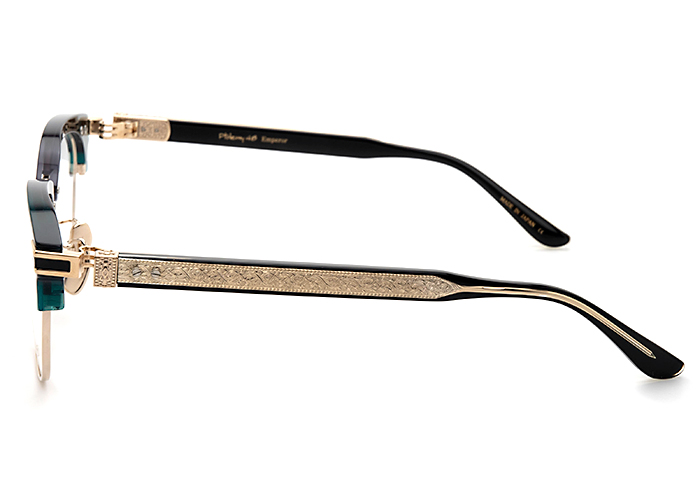 細部まで日本の巧職人が丁寧に作り込まれ、精緻なロココデザインをテンプルに地彫り彫金で作り出しました。1950年代からインスパイアしたサーモントスタイルの丸みのあるウエリントンシェープデザイン。シャープ感溢れるエッジを強く押し出したレンズシェイプによってあらゆる角度から見てもお洒落を演出し、6mm厚のを油圧プレスで創り出しました。テンプルは1730年代に流行した、植物の葉のような複雑な曲線を用いたロカイユ装飾をインスパイアし、優雅で繊細なロココ模様を地彫り彫金で創り出しました。トレミー48のアイコン鎧のオニキス七宝から、合口部分の新機構の一体鋳造型ヒンジが、一段と高級感を演出しています。