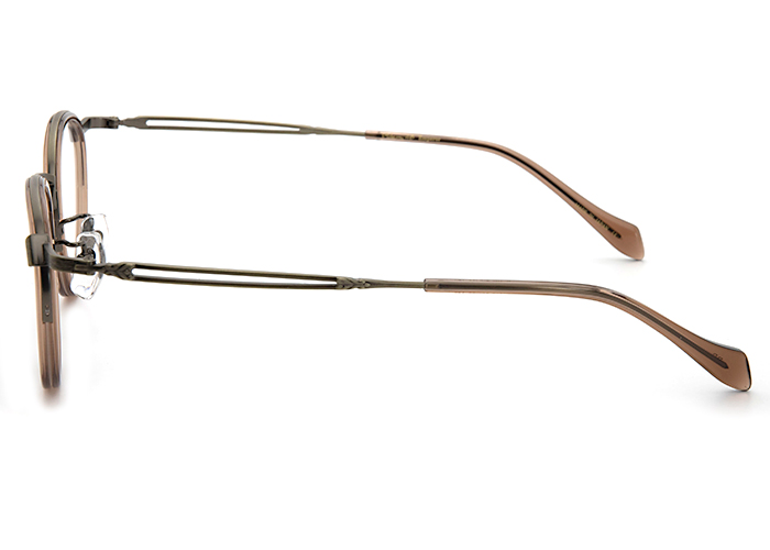 ベストセラーモデルE-046のリメイクモデル。ナイロールでセル枠とレンズを固定した製法を用いたデザインを採用。今回はテンプル先にモダンを採用しました。上部はメタル、下部はナイロンでボリュームを抑え、斜めや側方から見られた時に軽やかな印象となっています。鎧パーツは光化学要素に重要な傾斜角を求められるために、鎧とリムを掴むステイは高度な職人技でロウ付け無しの一体プレスで加工で作り上げました。