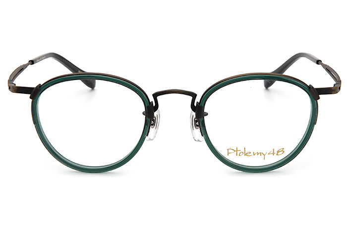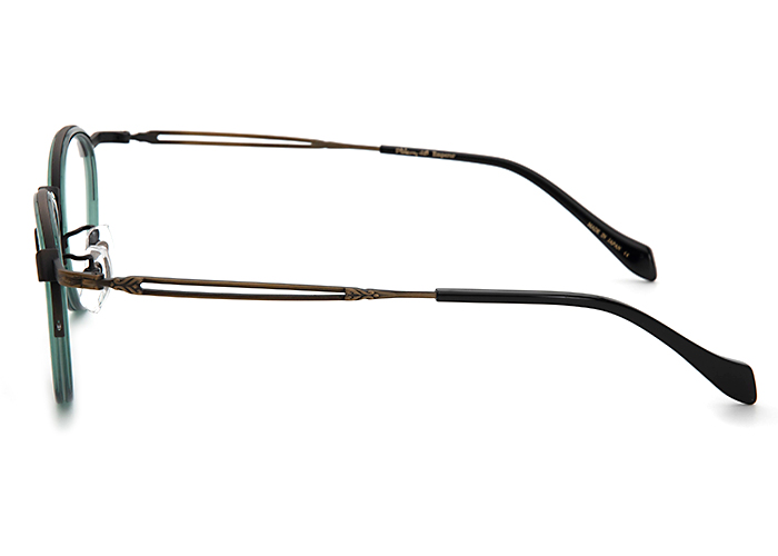 ベストセラーモデルE-046のリメイクモデル。ナイロールでセル枠とレンズを固定した製法を用いたデザインを採用。今回はテンプル先にモダンを採用しました。上部はメタル、下部はナイロンでボリュームを抑え、斜めや側方から見られた時に軽やかな印象となっています。鎧パーツは光化学要素に重要な傾斜角を求められるために、鎧とリムを掴むステイは高度な職人技でロウ付け無しの一体プレスで加工で作り上げました。