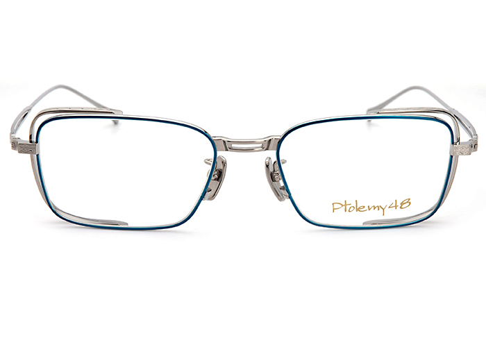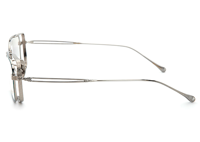 スクエア( 四角) シェイプのフレームに繊細な抜きのブリッジを組み合わせ、リム後部にはチタンフードを装着しています。このデザインは光学的要素を考慮し開発されたもので、サイドや後方から入る光をチタンフードで抑えることができレンズ乱反射を防止し、目を保護するために開発された優れものです。チタン素材のフードには、職人の匠技で美しい精巧な彫金を作り出しています。