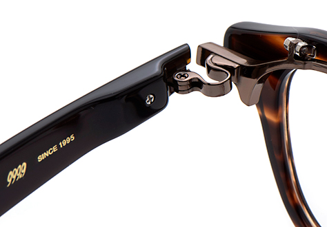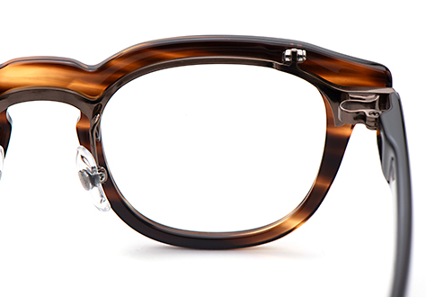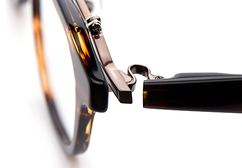 跳ね上げスタイルのフレーム特有の負荷を想定した逆Rヒンジ。掛け外しやフロント開閉時の際など様々な負荷を解消し、型崩れを抑え、快適な掛け心地をながく保ちます。