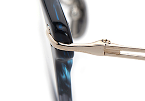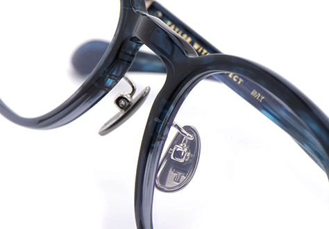 一目でわかるブランドイニシャルのヨロイパーツ。フロントとテンプルを繋ぐヨロイは、上下左右からの負荷がかかる重要な箇所。負荷をできるだけ分散するように設計されています。またネジ止め用のパイプとヨロイが一体のため、経年使用の破損に強い構造となっています。