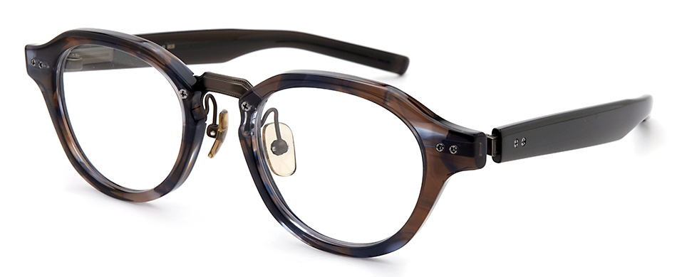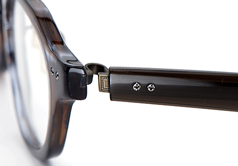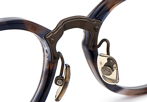 輪郭を際立たせるプラスチックリムに、ミル模様を施した存在感あるメタルブリッジを組み合わせた、印象的なフロントデザイン。また、テンプル合口から覗く芯金や合口裏面のパーツなど、細部にまで至る丁寧な作り込みが、格別の上質感をもたらします。