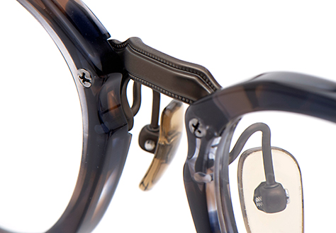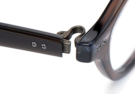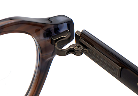 フロント裏面に切削を施し逆Rヒンジの土台を四方から囲むように配置、土台と一体のネジ受けパイプに前面から2本のネジで固定しています。メタルパーツによってしっかり固定し支えることで、逆Rヒンジの機能を最大限に引き出し、快適で上質な掛け心地を実現します。