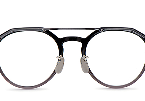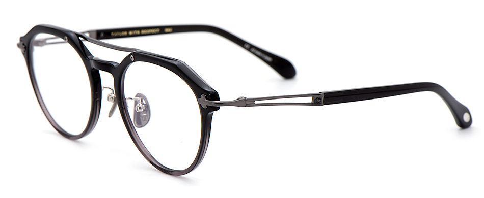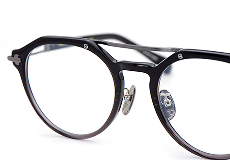 フロントに採用したオリジナルパーツTスパインを、ツーブリッジのワタリに見立てた新しい感覚のアセテートコンビネーション。クラウンパントのフォルムとツーブリッジが融合する個性的なフロントデザインです。