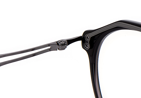 一目でわかるブランドイニシャルのヨロイパーツ。フロントとテンプルを繋ぐヨロイは、上下左右からの負荷がかかる重要な箇所。負荷をできるだけ分散するように設計されています。またネジ止め用のパイプとヨロイが一体のため、経年使用の破損に強い構造となっています。
