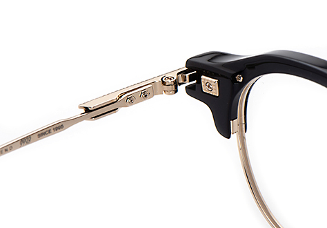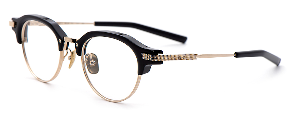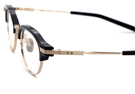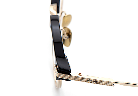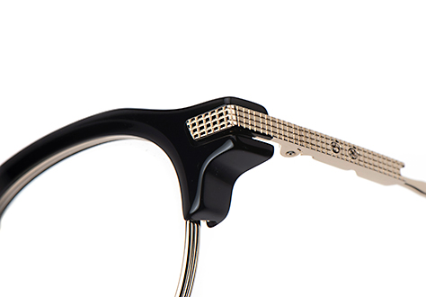 ブリッジとテンプルにはハイエンドラインのアイコンとなるブロックパターンを配置。プラスチックの重厚感とメタルの精緻さが高い次元で融合したシリーズです。