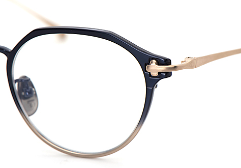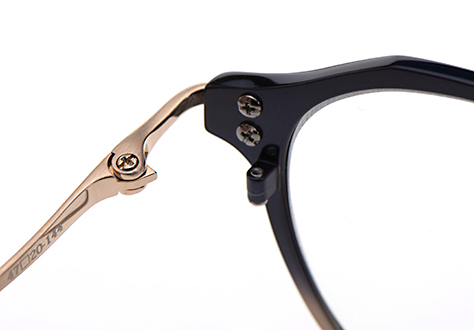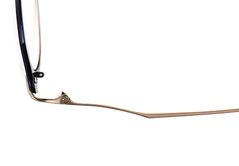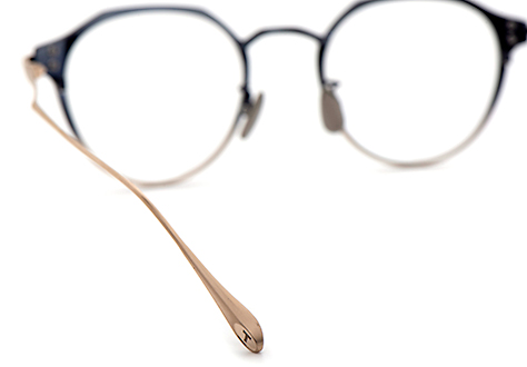 一目でわかるブランドイニシャルのヨロイパーツ。フロントとテンプルを繋ぐヨロイは、上下左右からの負荷がかかる重要な箇所。負荷をできるだけ分散するように設計されています。またネジ止め用のパイプとヨロイが一体のため、経年使用の破損に強い構造となっています。