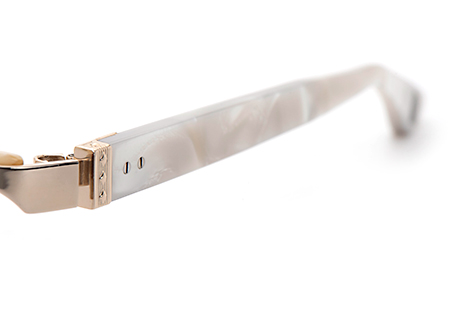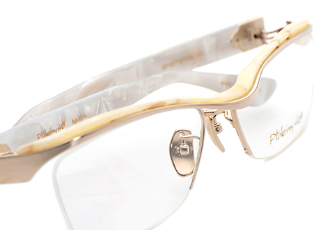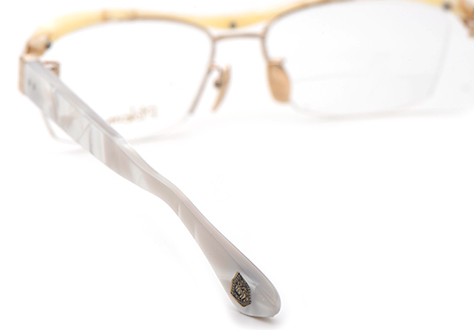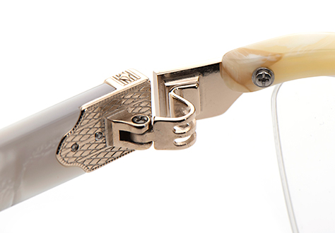 セルロイドテンプルはノー芯工法でありながら、弾力性を持たせるために削り出し方式を採用。一見重量感あるモデルに見えますが、掛けてみると非常にバランスのよい仕上がり。テンプルエンドにはナイトモチーフのプレートが埋め込まれています。